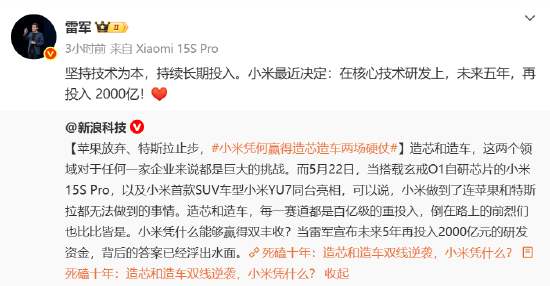 新浪科技讯 5月26日下午消息炒股配资杠杆,小米创办人,董事长兼CEO雷军在微博表示,“坚持技术为本,持续长期投入。小米最近决定:在核心技术研发上,未来五年,再投入2000亿!”